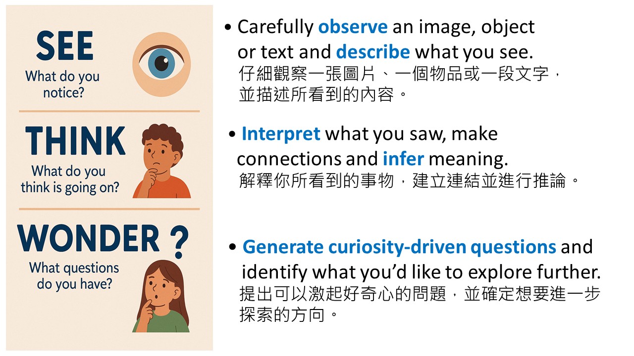 See–Think–Wonder是由哈佛大學零點計畫(Project Zero)所發展的一套思考常規,常在課堂中運用,它提供一種結構化的方式來引導探究與討論。