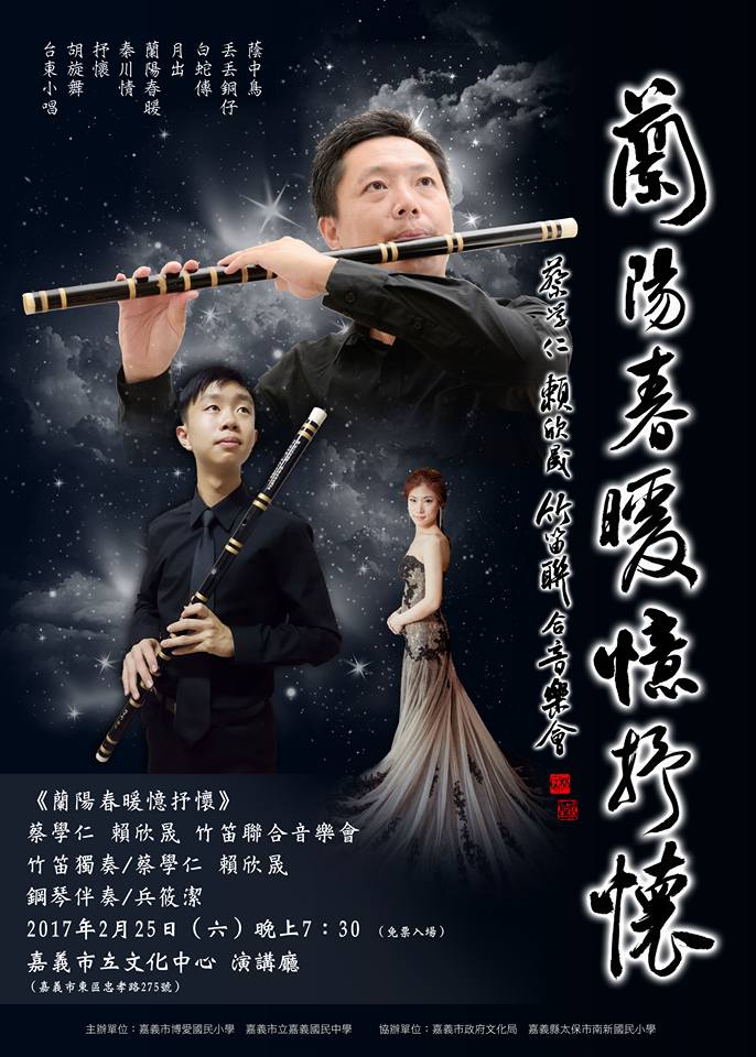 竹笛獨奏/蔡學仁 竹笛獨奏/賴欣晟 鋼琴伴奏/兵筱潔 2017年2月25日(六)晚上7:30(免費入場) 嘉義市立文化中心 演講廳 (嘉義市東區忠孝路275號)
