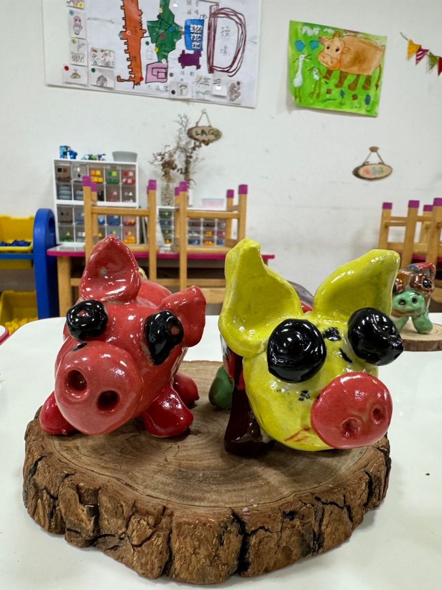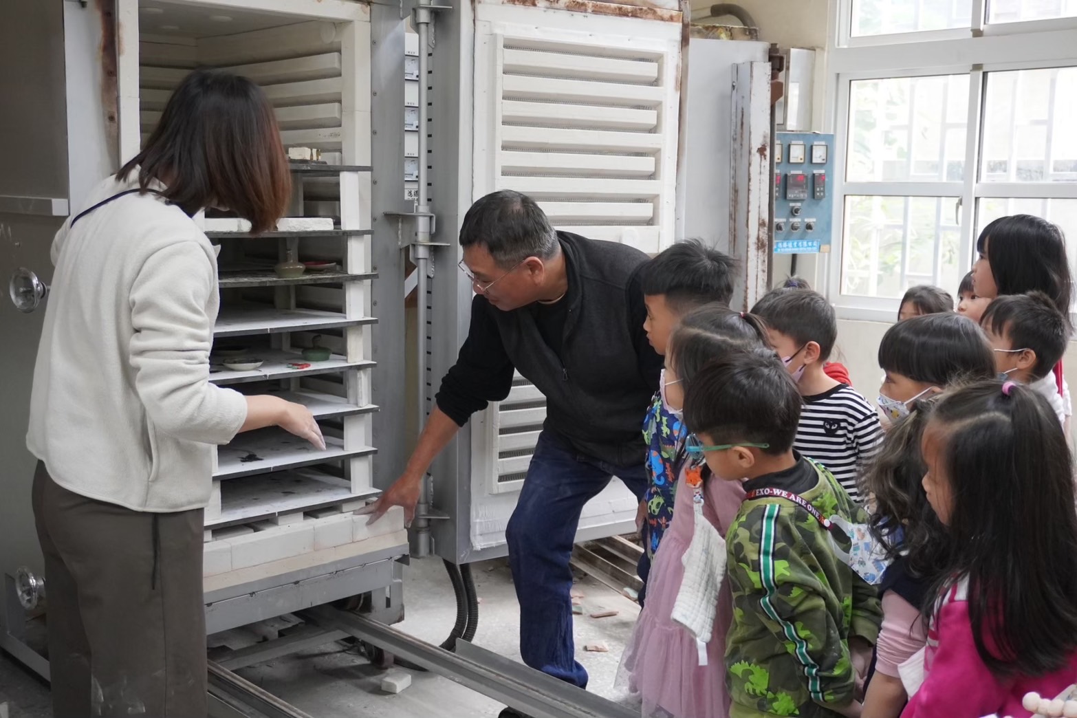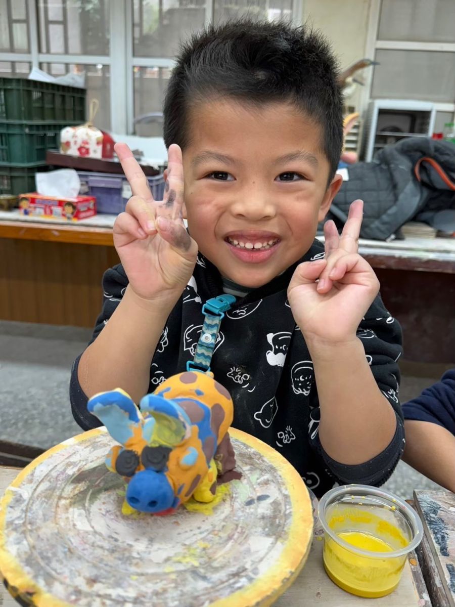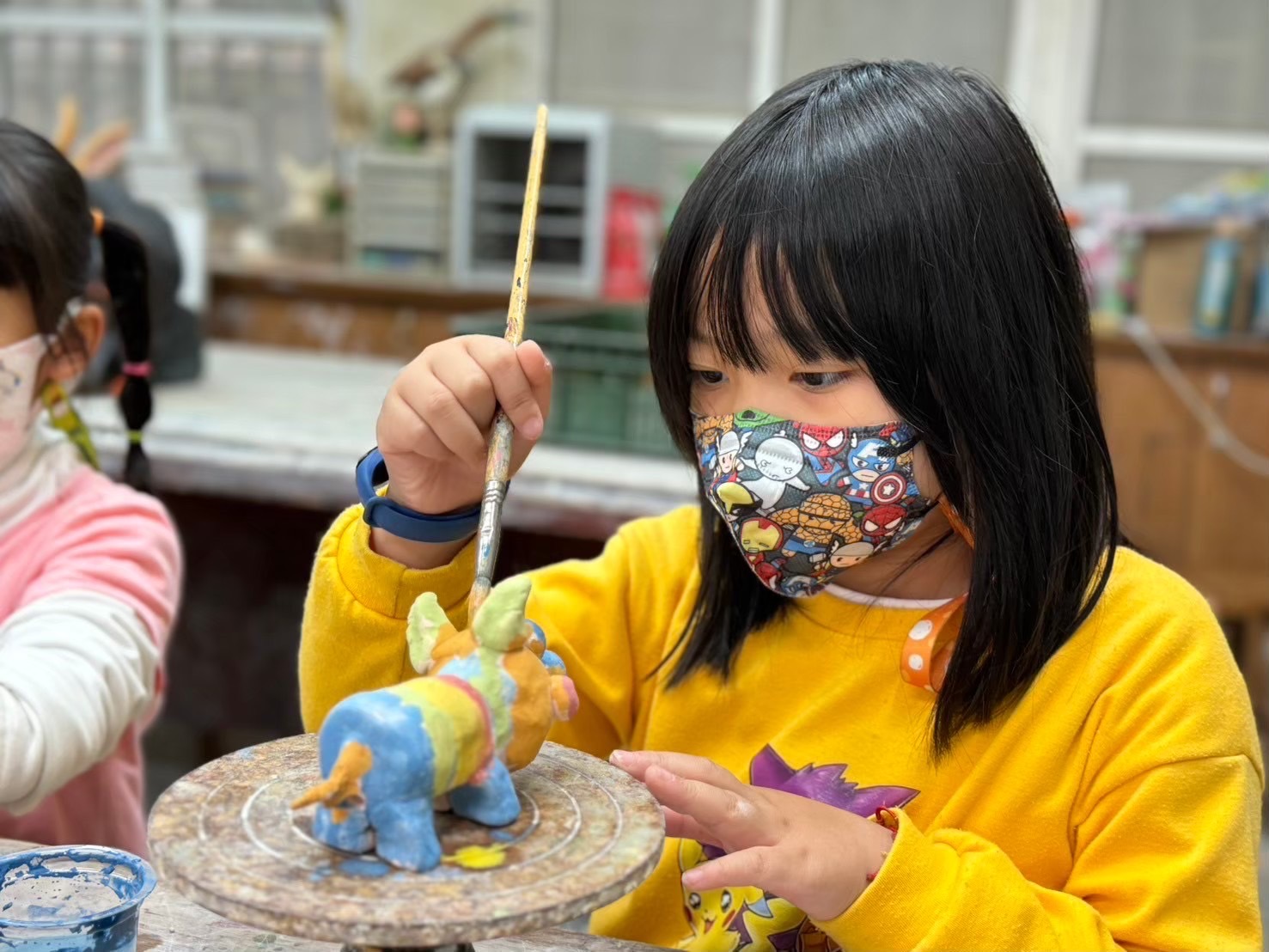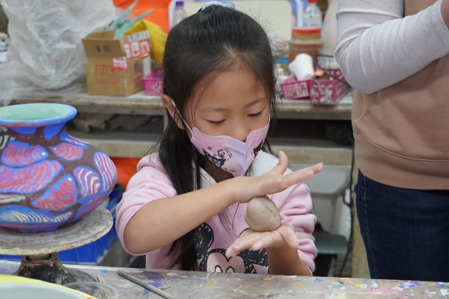 在秉勳老師的引導下,寶貝們學習捏塑的不同方法,像是搓圓、壓扁、在陶土上刮一刮沾泥漿把兩塊陶土黏起來、遇到隙縫可以用泥漿來填補…等。也認識到陶土作品的製作過程,需要從捏陶、素燒、上釉、釉燒中一步步耐心的完成;也從素燒後的陶藝作品和上釉與釉燒後的作品觀察到其中的差異。以及參觀了燒製陶土的電窯是像冰箱一樣的長方形形體,還可以一層一層堆疊作品喔!