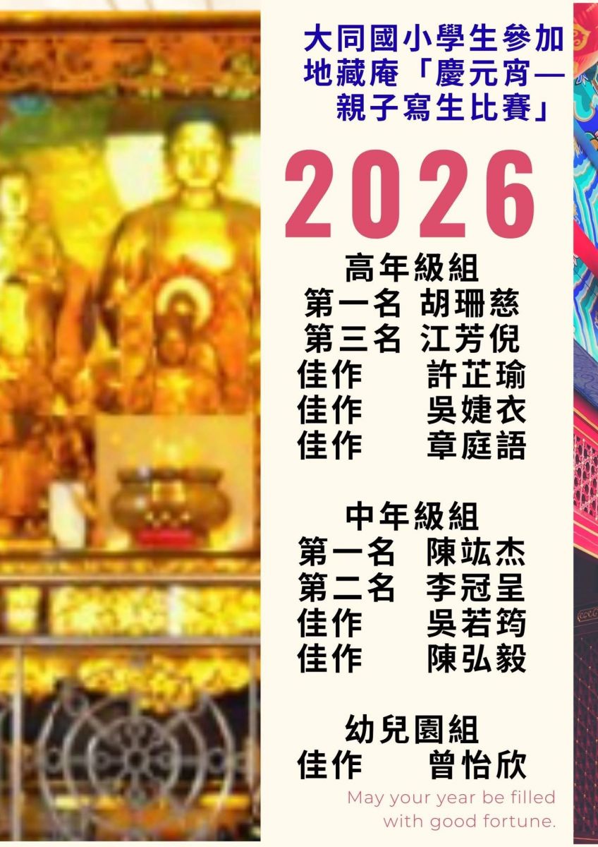 賀!大同國小學生參加九華山地藏庵115年度慶元宵親子寫生比賽,成績斐然!