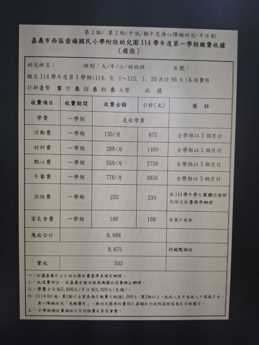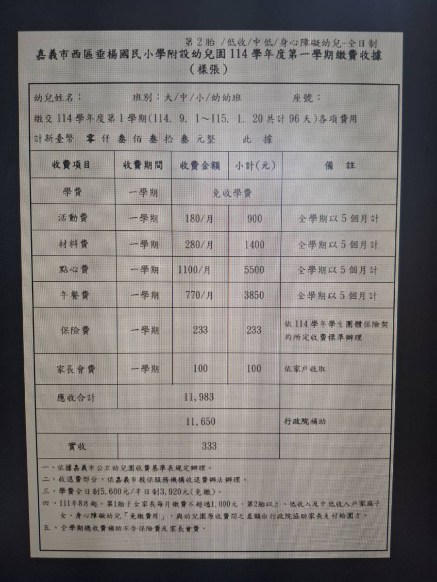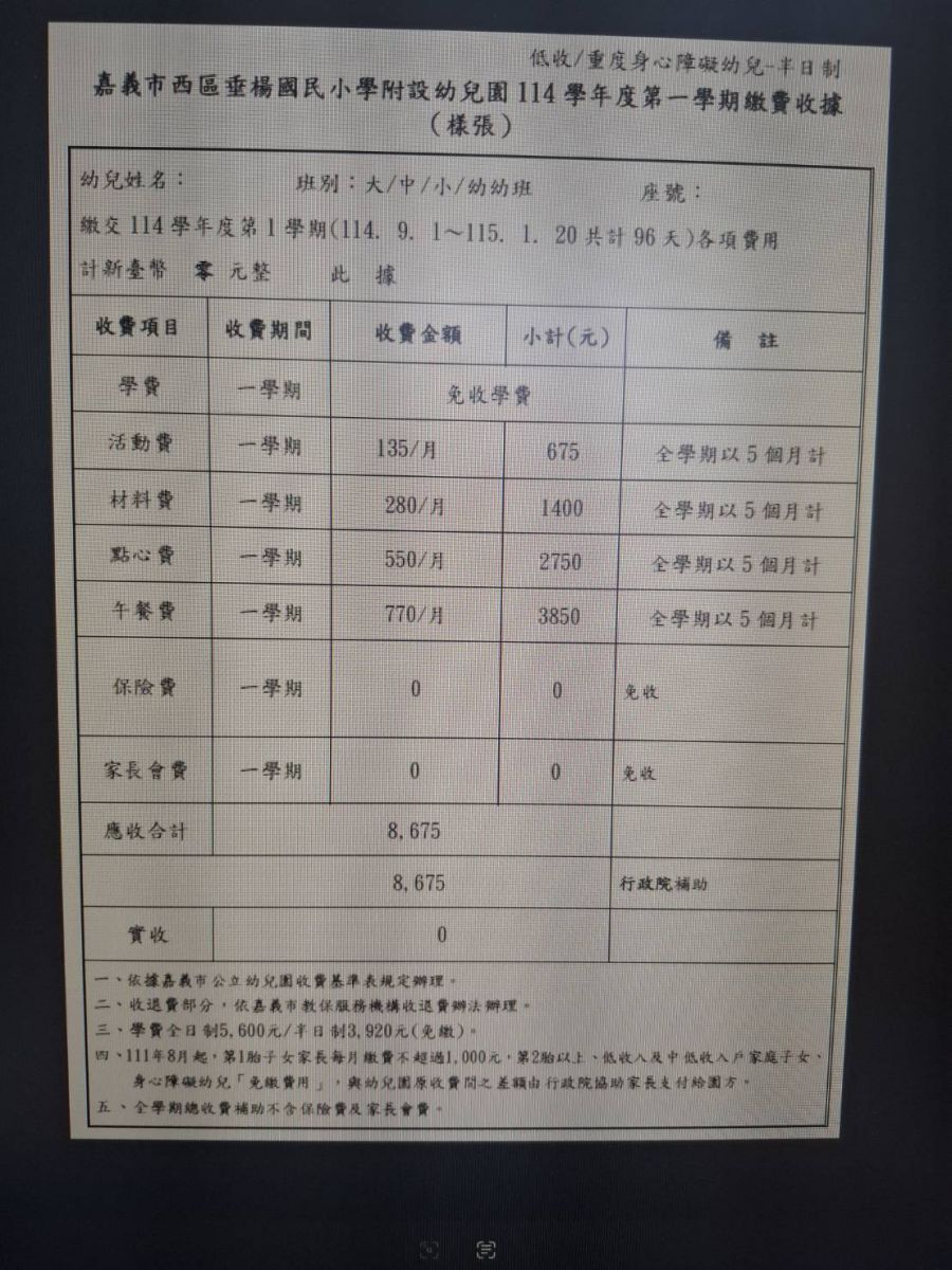 114學年度第1學期 嘉義市西區垂楊國民小學附設幼兒園收費公告